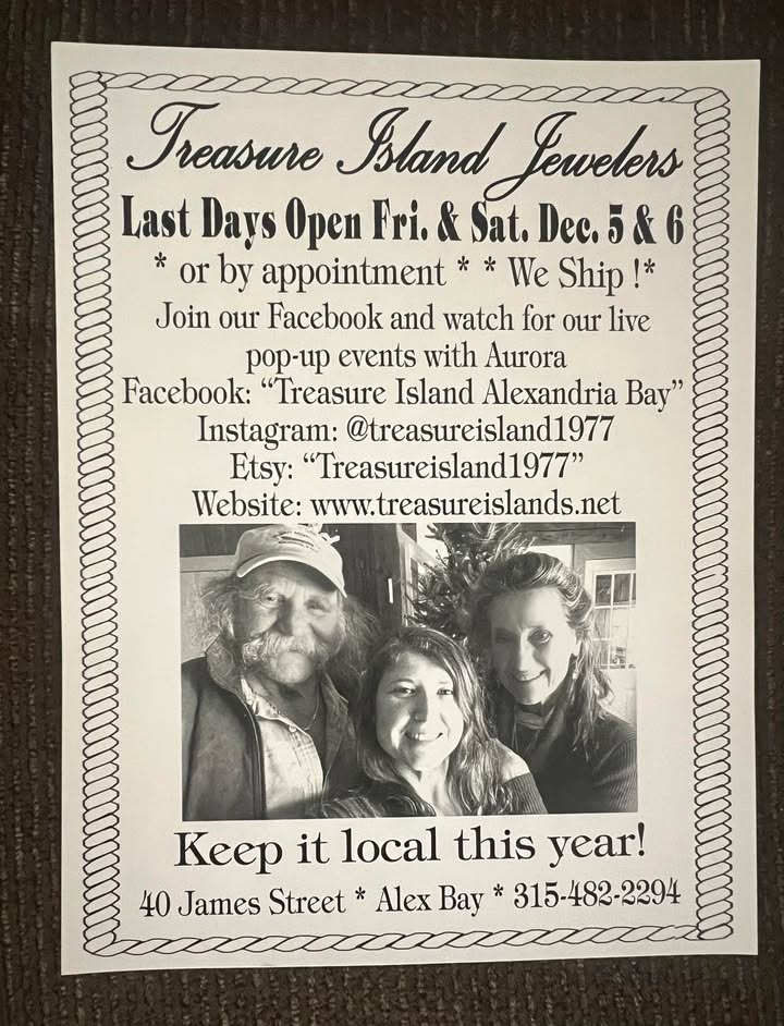 Treasure Island Jewelers and Gifts in Alexandria Bay, New York, will be open for business on Friday, December 5, 2025, and Saturday, December 6, 2025. The store will open at 10 a.m. on both days. Customers can visit the store at 40 James Street in Alexandria Bay or call 315-482-2294 for more information. Treasure Island offers unique gifts and also ships items. Shoppers can connect with the store through their Facebook page "Treasure Island Alexandria Bay," Instagram account @treasureisland1977, and Etsy shop "Treasureisland1977." Additional details are available on their website at www.treasureislands.net.